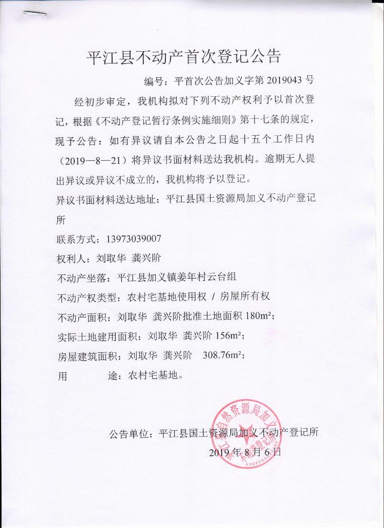 刘取华 龚兴阶平江县不动产首次登记公告