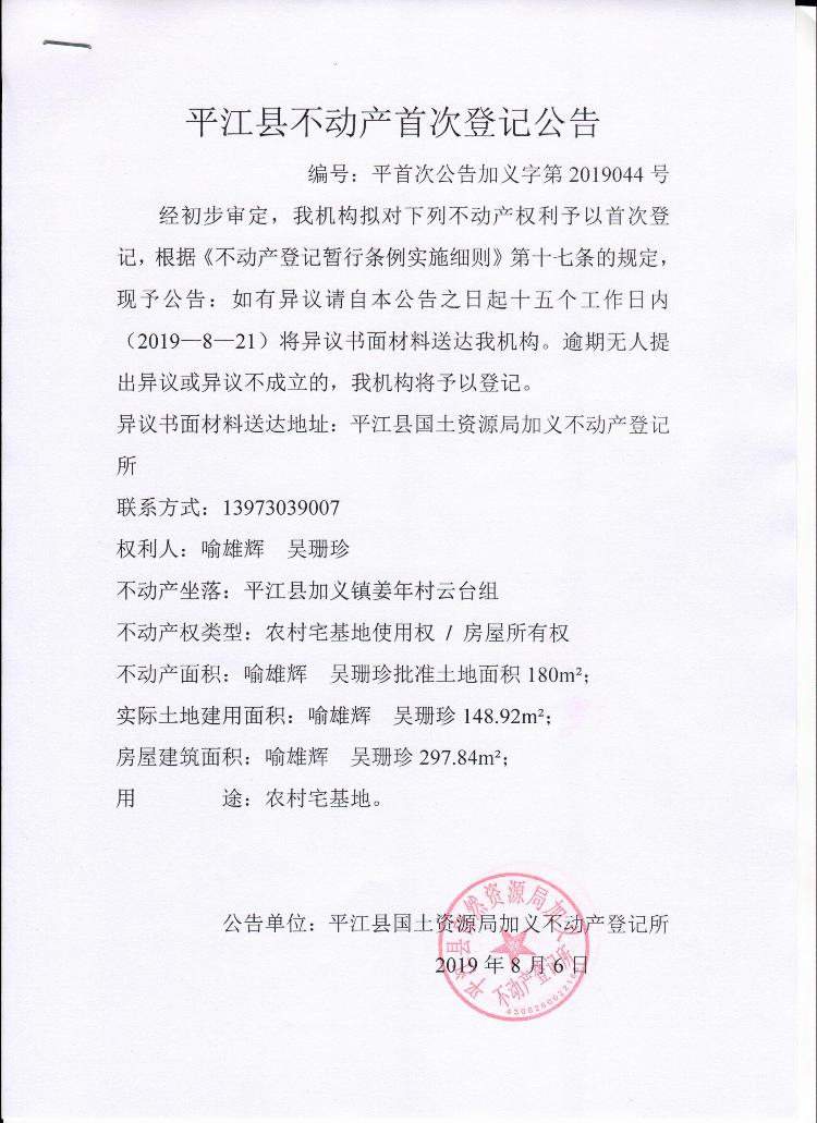 喻雄辉 吴珊珍平江县不动产首次登记公告