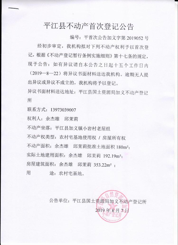 余杰雄 邱茉莉平江县不动产首次登记公告