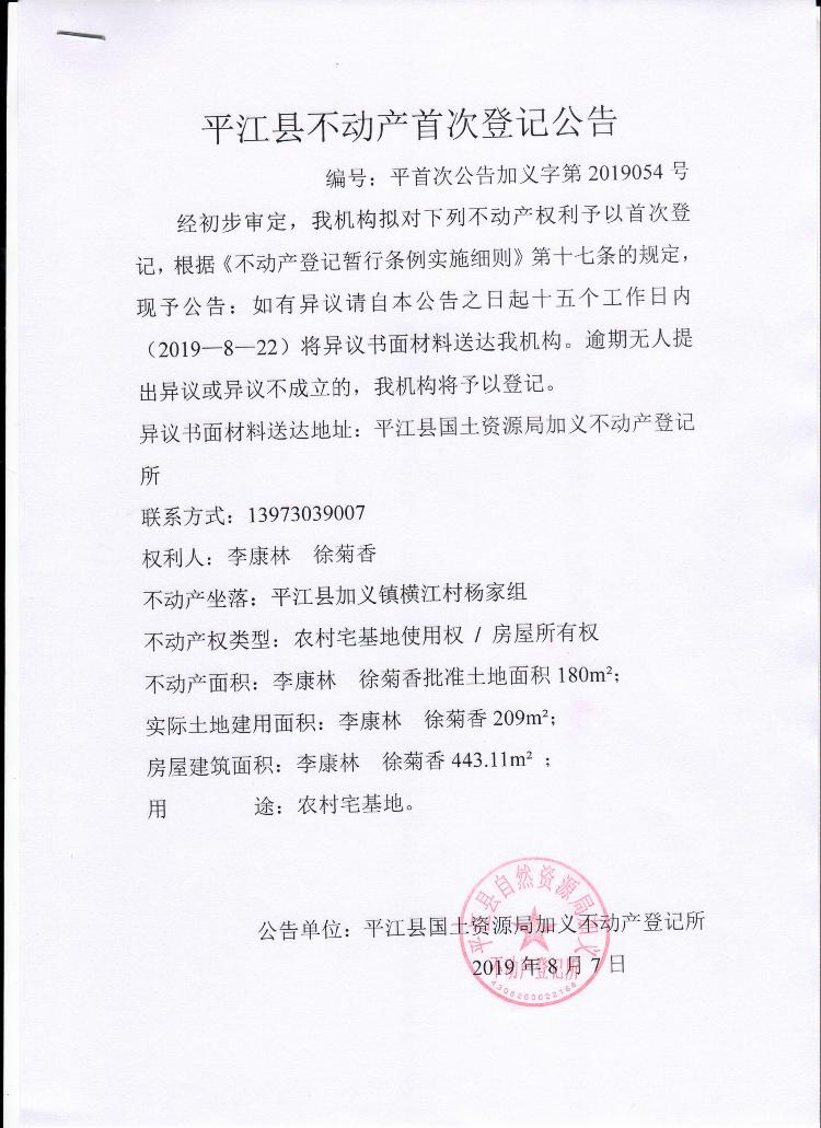 李康林 徐菊香平江县不动产首次登记公告