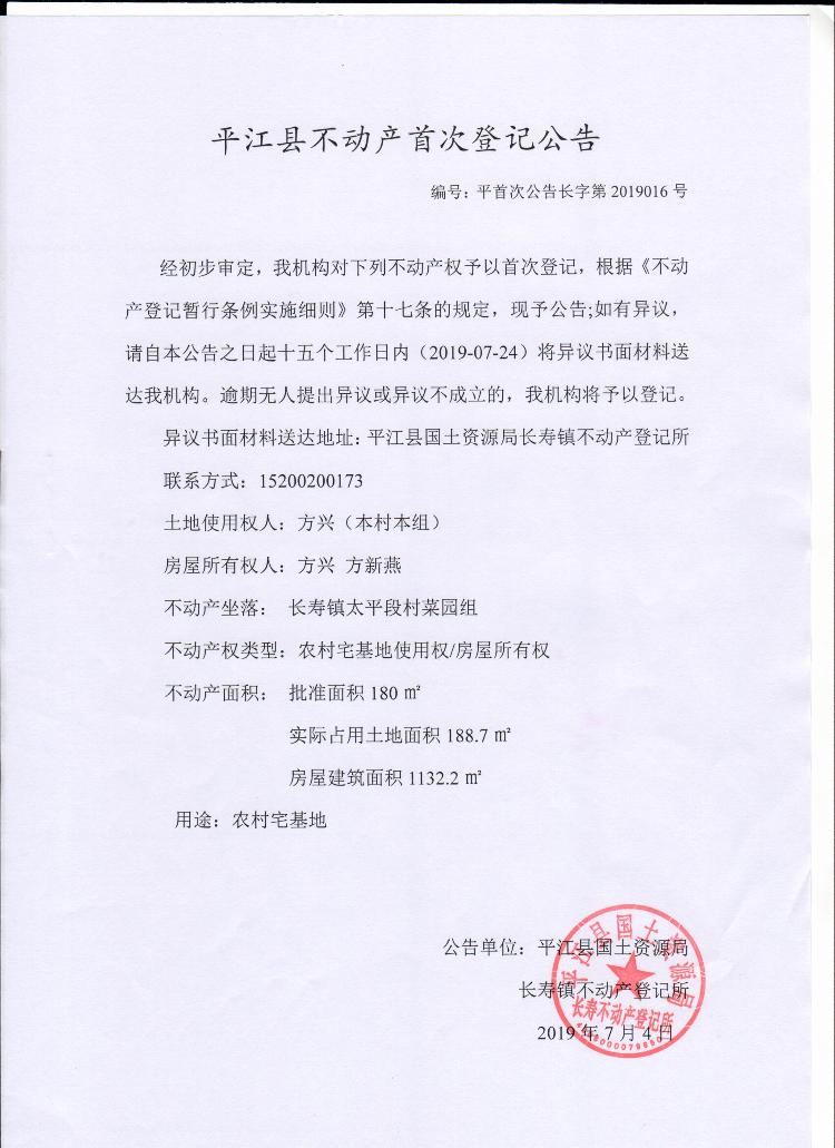 方兴 方新燕平江县不动产首次登记公告平首次公告长字第2019016号