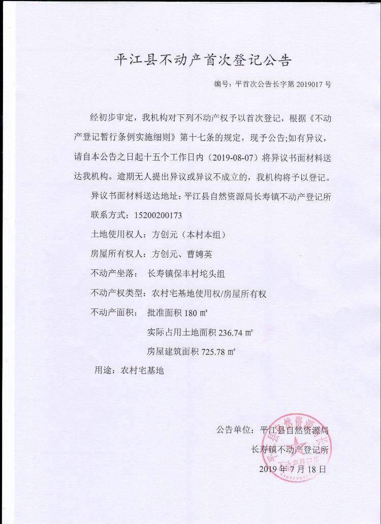 方创元 曹娉英平江县不动产首次登记公告平首次公告长字第2019017号