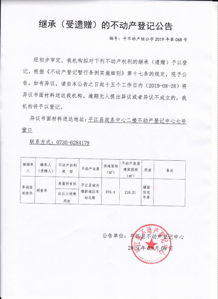 胡香华继承(受遗赠)的不动产登记公告
