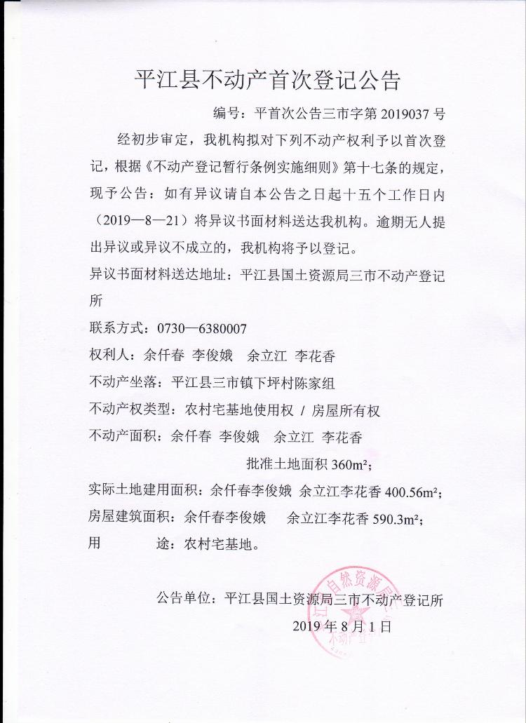 余仟春 李俊娥,余立江 李花香平江县不动产首次登记公告平首次公告三市字第2019037