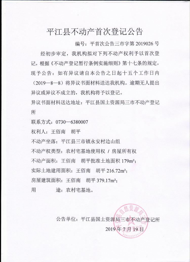 王佰南 胡平平江县不动产首次登记公告平首次公告三市字第2019026