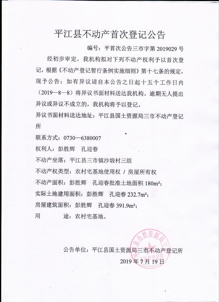 彭胜辉 孔迎春平江县不动产首次登记公告平首次公告三市字第2019029