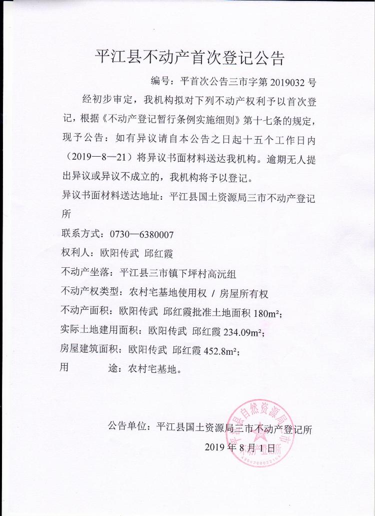 欧阳传武 邱红霞平江县不动产首次登记公告平首次公告三市字第2019032