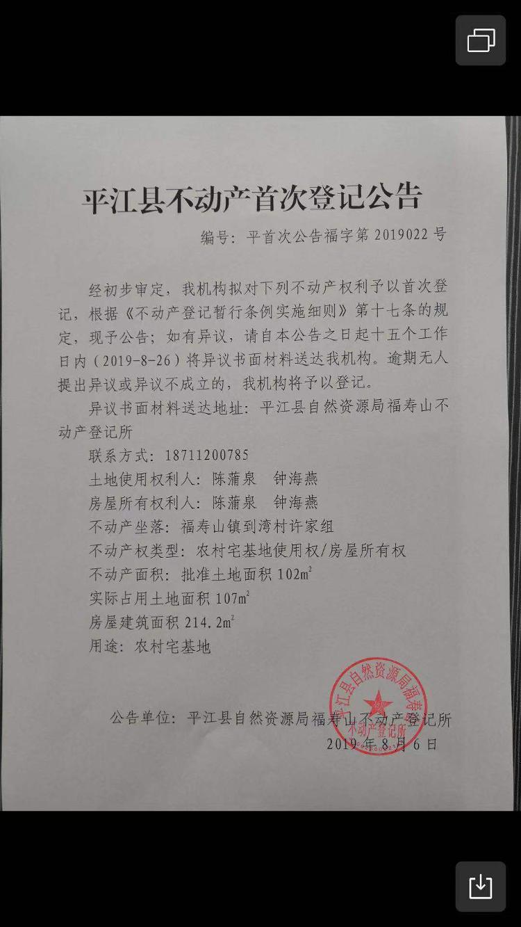 陈蒲泉 钟海燕平江县不动产首次登记公告