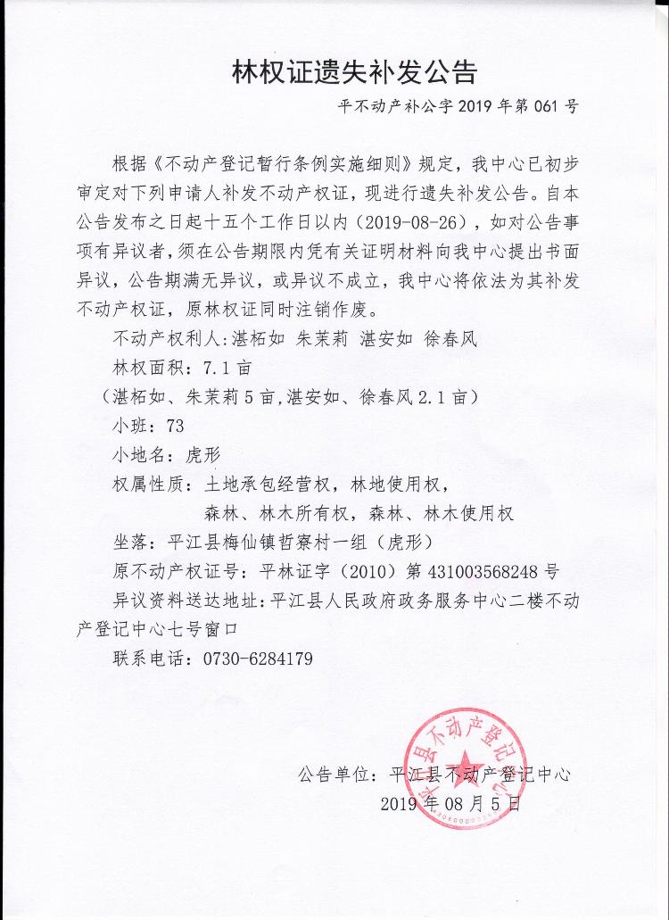 湛柘如 朱茉莉 湛安如 徐春风林权证遗失补发公告