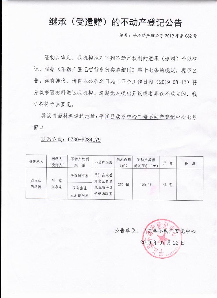 刘慧 刘春泉继承(受遗赠)的不动产登记公告平不动产继公字2019年第062号