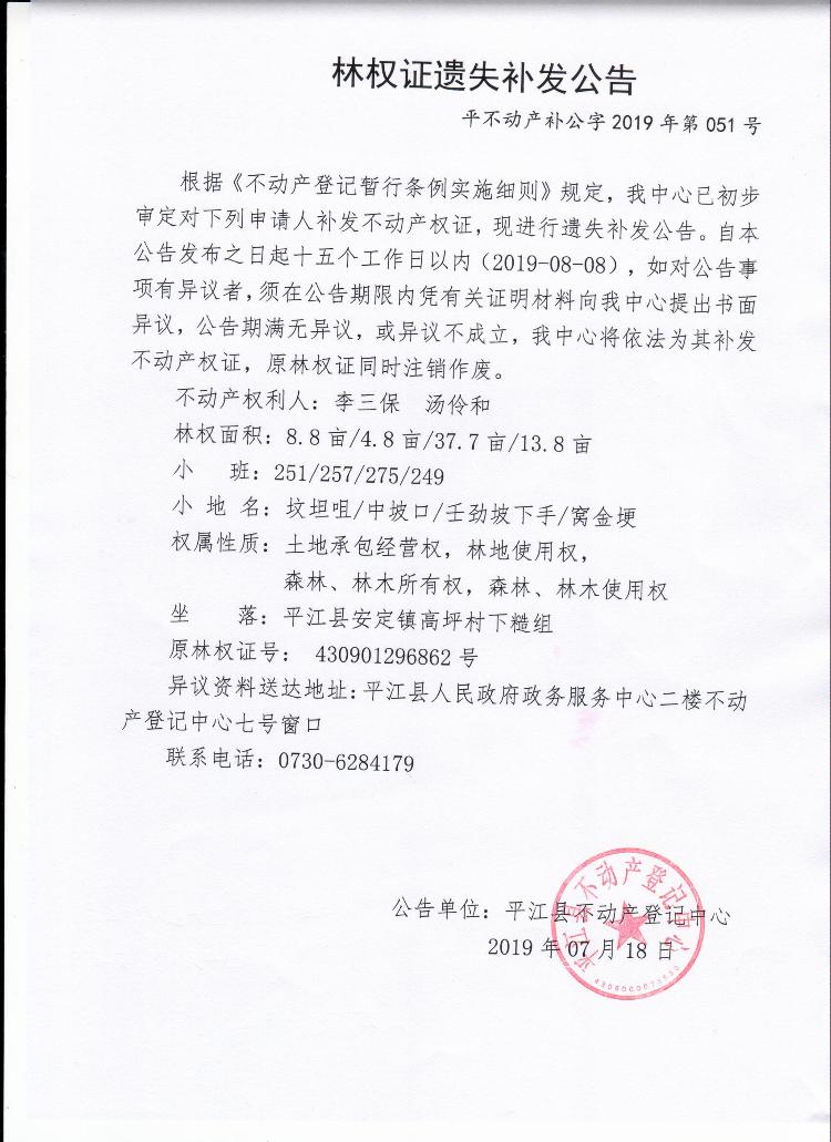 李三保 汤伶和林权证遗失补发公告平不动产补公字2019年第051号