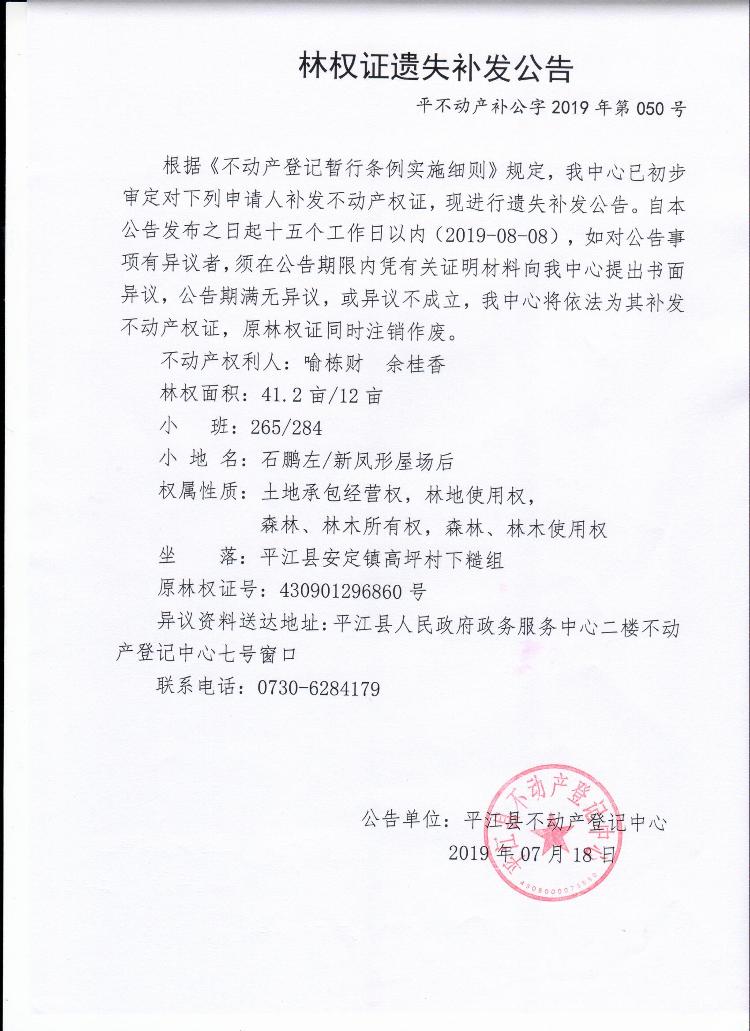 喻栋财 余桂香林权证遗失补发公告平不动产补公字2019年第050号