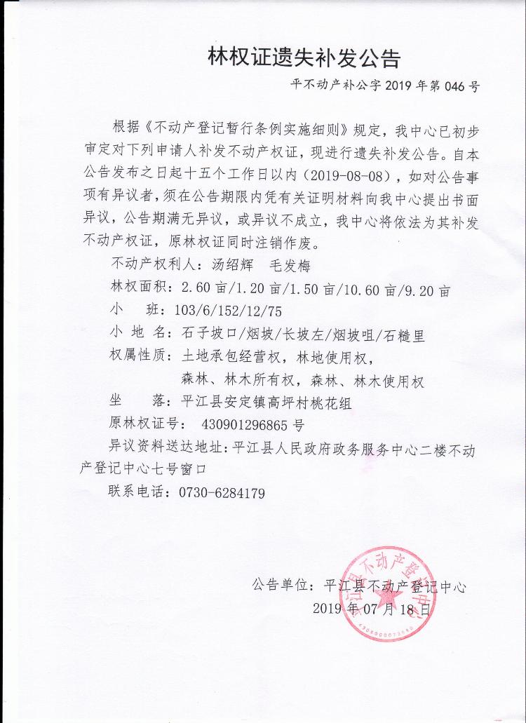 汤绍辉 毛发梅林权证遗失补发公告平不动产补公字2019年第046号