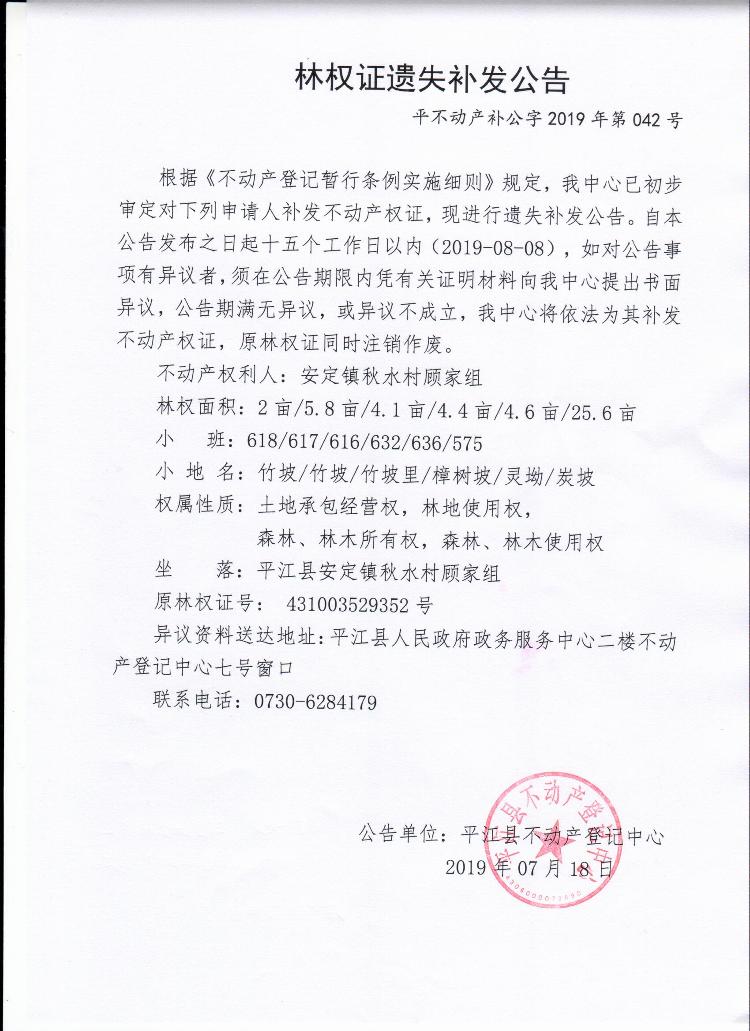 安定镇秋水村顾家组林权证遗失补发公告平不动产补公字2019年第042号