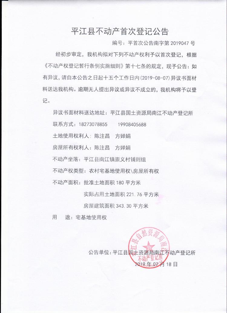 陈注昌 方婵娟平江县不动产首次登记公告平首次公告南字第2019047号