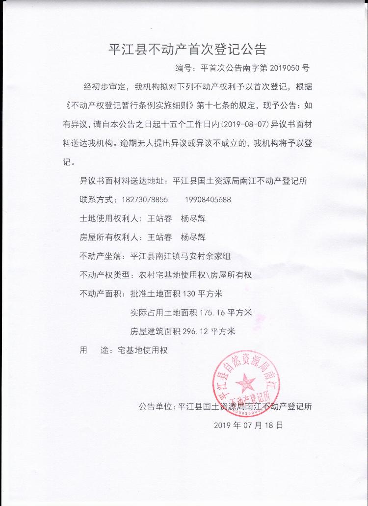 王站春 杨尽辉平江县不动产首次登记公告平首次公告南字第2019050号