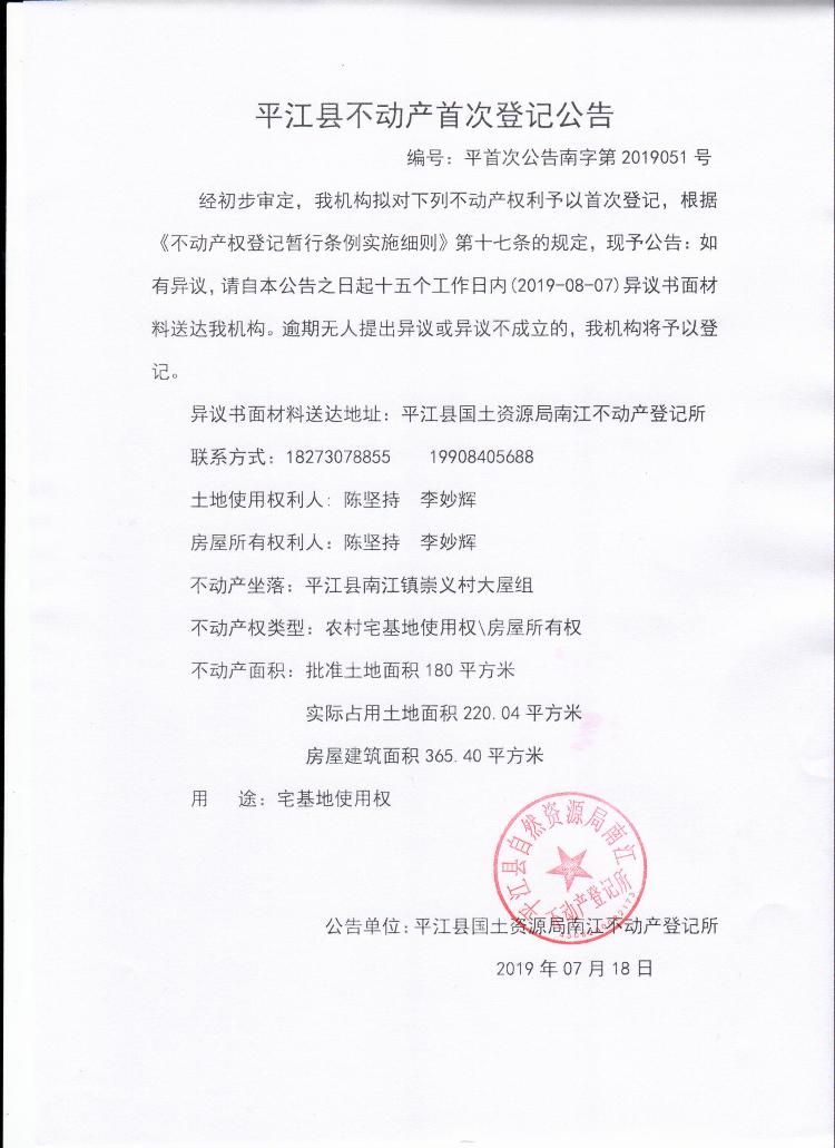 陈坚持 李妙辉平江县不动产首次登记公告平首次公告南字第2019051号