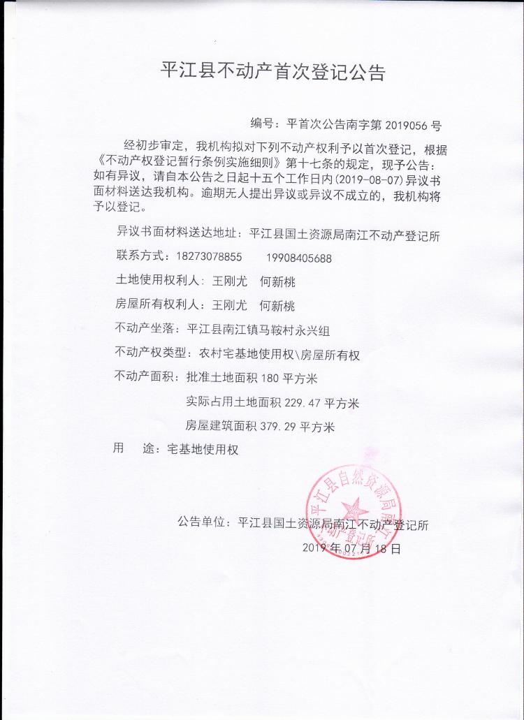 王刚尤 何新桃平江县不动产首次登记公告平首次公告南字第2019056号
