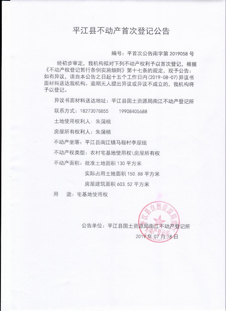 朱蒲桃平江县不动产首次登记公告平首次公告南字第2019058号