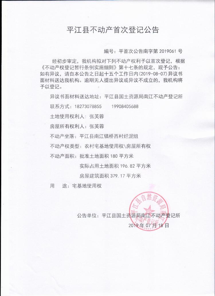 张芙蓉平江县不动产首次登记公告平首次公告南字第2019061号
