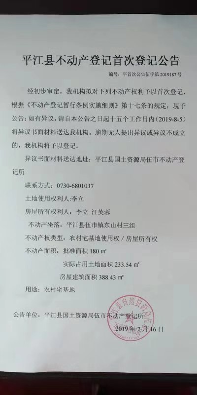 李立平江县不动产首次登记公告平首次公告伍字第2019187号