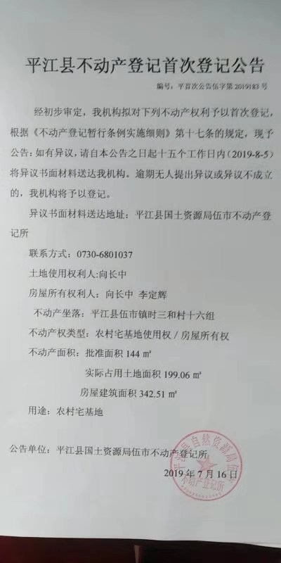 向长中平江县不动产首次登记公告平首次公告伍字第2019183号