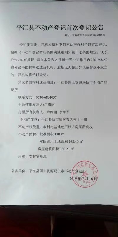 卢绚丽平江县不动产首次登记公告平首次公告伍字第2019182号