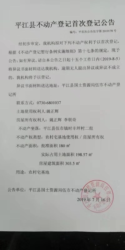 姚正辉平江县不动产首次登记公告平首次公告伍字第2019178号