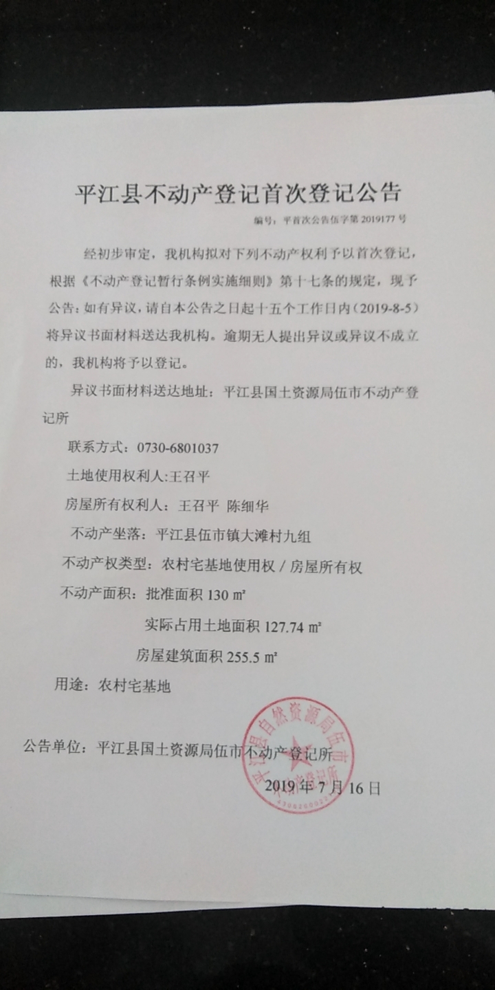 王召平平江县不动产首次登记公告平首次公告伍字第2019177号