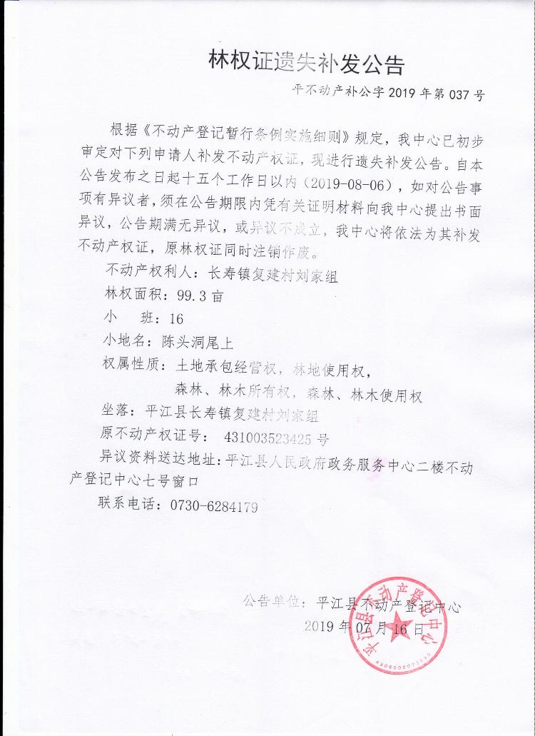 长寿镇复建村刘家组林权证遗失补发公告平不动产补公字2019年第037号