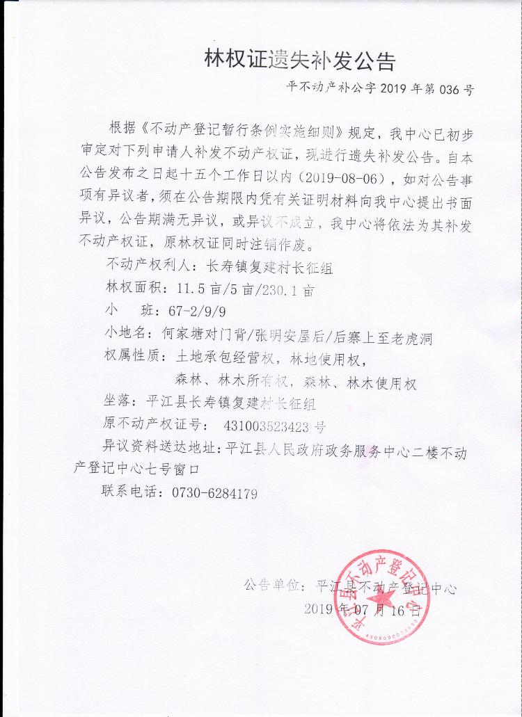 长寿镇复建村长征组林权证遗失补发公告平不动产补公字2019年第036号