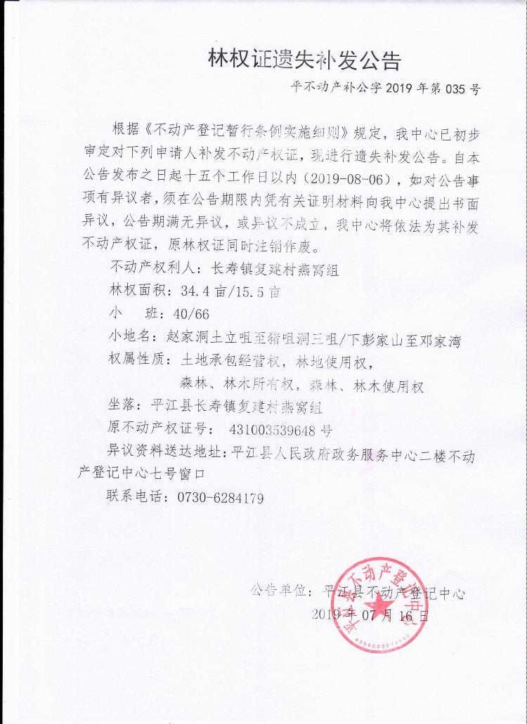 长寿镇复建村燕窝组林权证遗失补发公告平不动产补公字2019年第035号