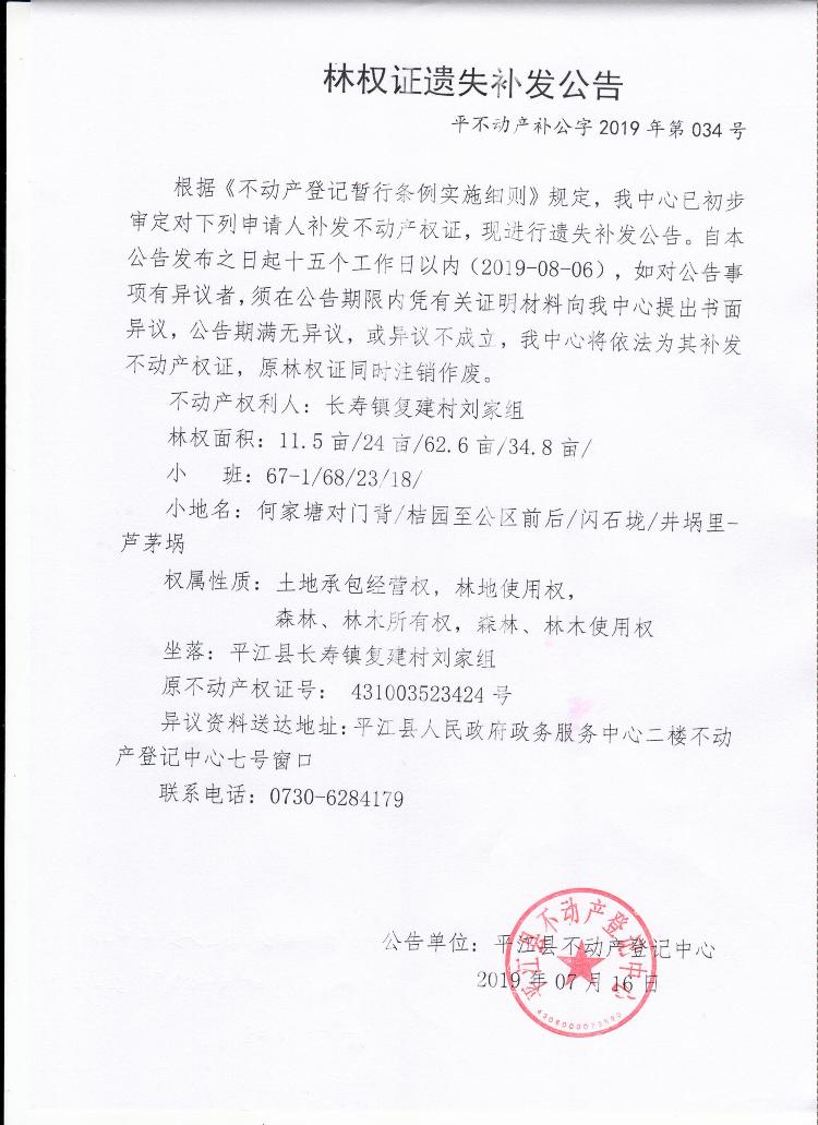 长寿镇复建村刘家组林权证遗失补发公告平不动产补公字2019年第034号