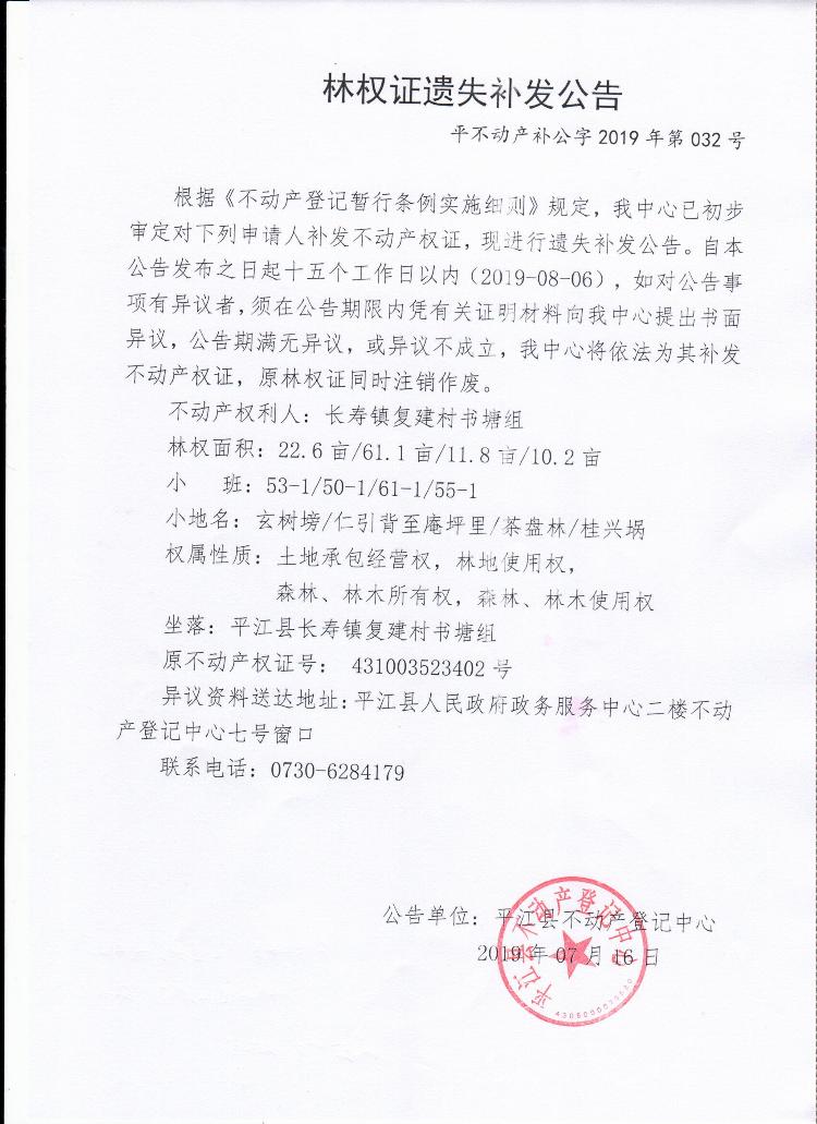 长寿镇复建村书塘组林权证遗失补发公告平不动产补公字2019年第032号