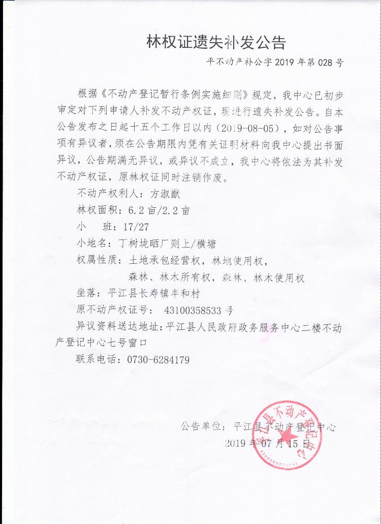 方淑猷林权证遗失补发公告平不动产补公字2019年第2019028号