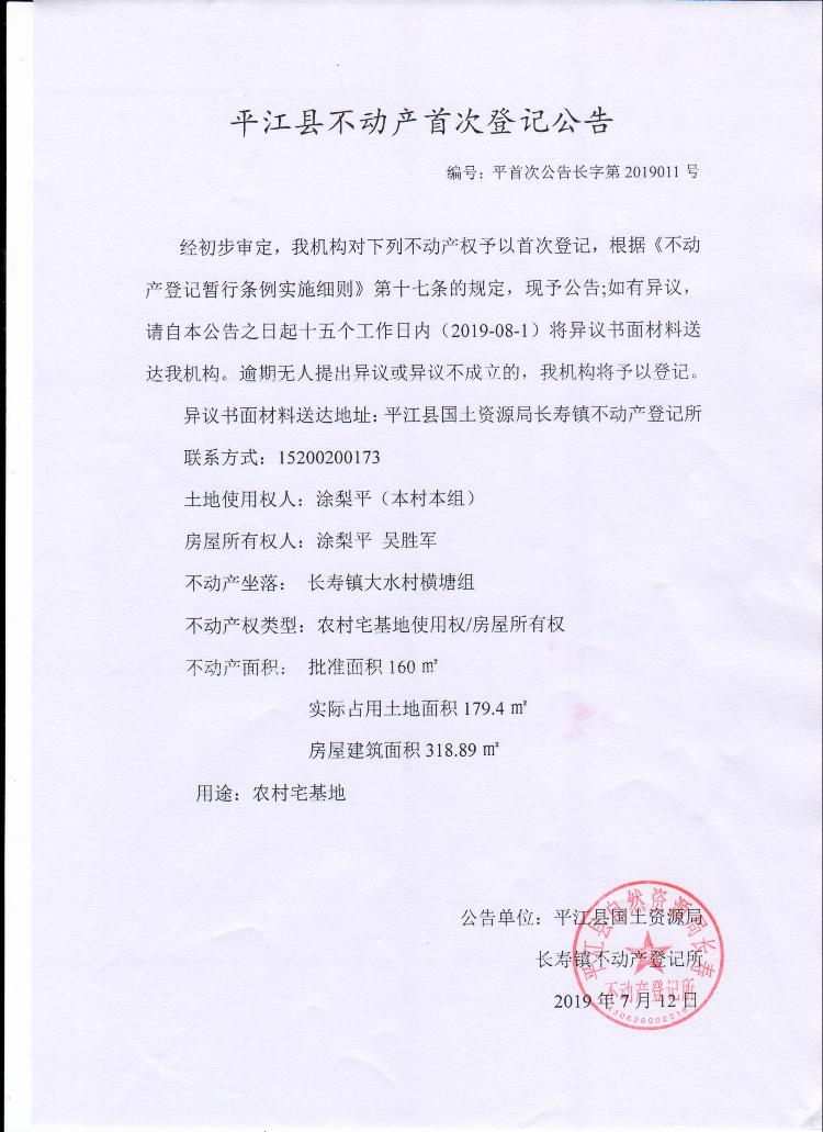 涂梨平平江县不动产首次登记公告平首次公告长字第2019011号