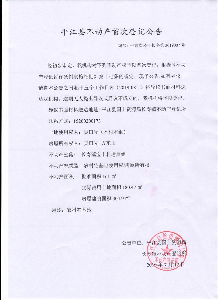 吴田光平江县不动产首次登记公告平首次公告长字第2019007号