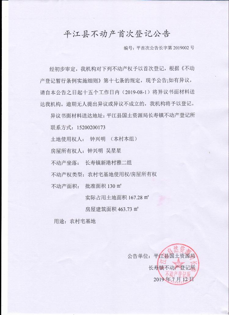 钟兴明平江县不动产首次登记公告平首次公告长字第2019002号