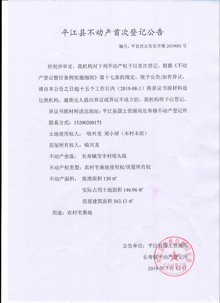 喻兴龙平江县不动产首次登记公告平首次公告长字第2019001号