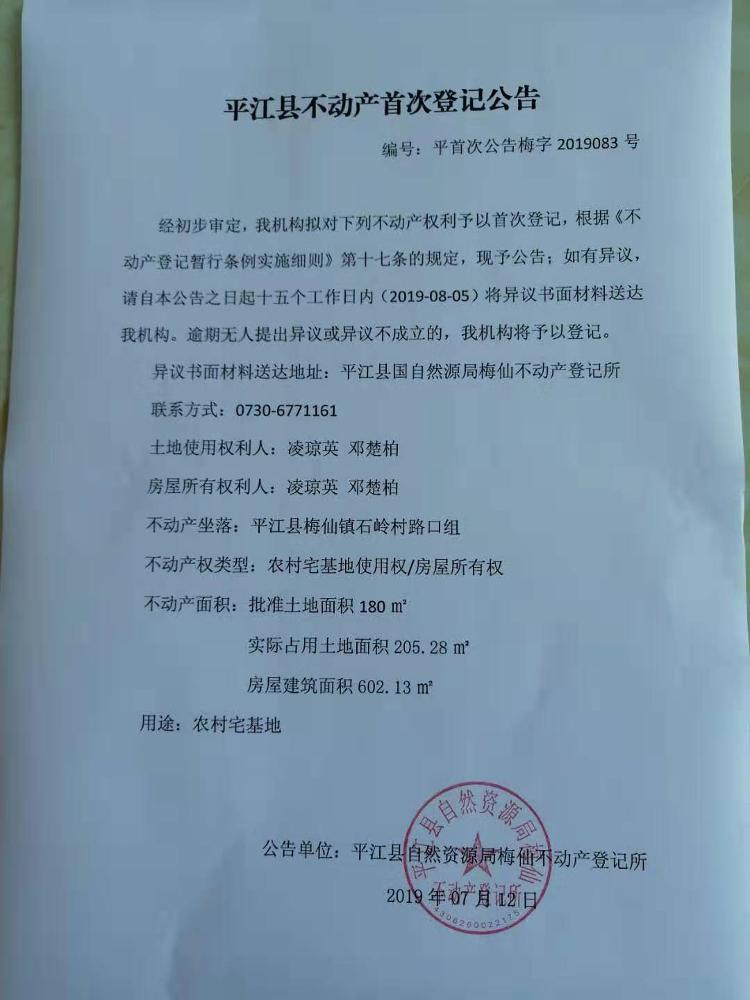 凌琼英平江县不动产首次登记公告平首次公告梅字2019083号