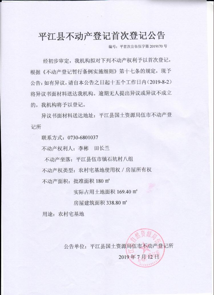 李彬 田长兰 平江县不动产首次登记公告 伍字第2019170号