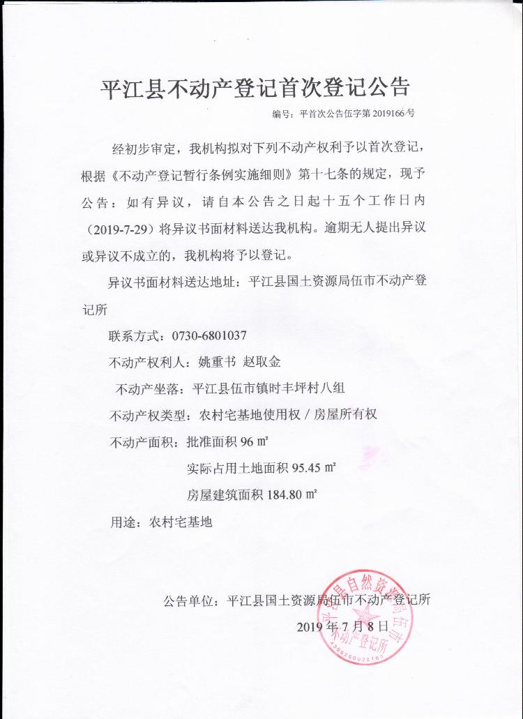 姚重书 赵取金 平江县不动产首次登记公告 伍字第2019166号