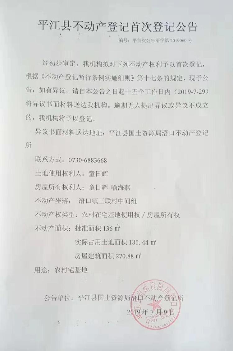 童日辉平江县不动产首次登记公告平首次公告浯字第2019060号