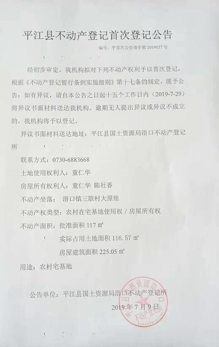 童仁华平江县不动产首次登记公告平首次公告浯字第2019057号