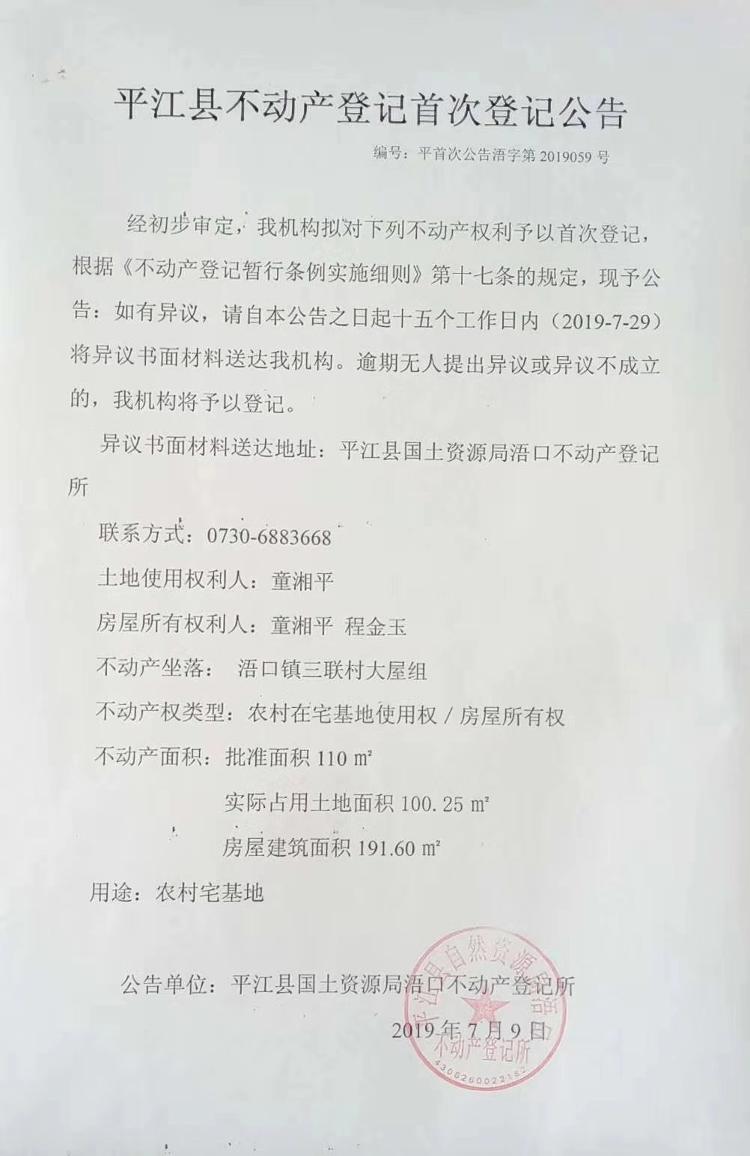 童湘平平江县不动产首次登记公告平首次公告浯字第2019059号