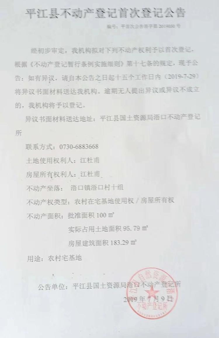 江杜甫平江县不动产首次登记公告平首次公告浯字第2019060号