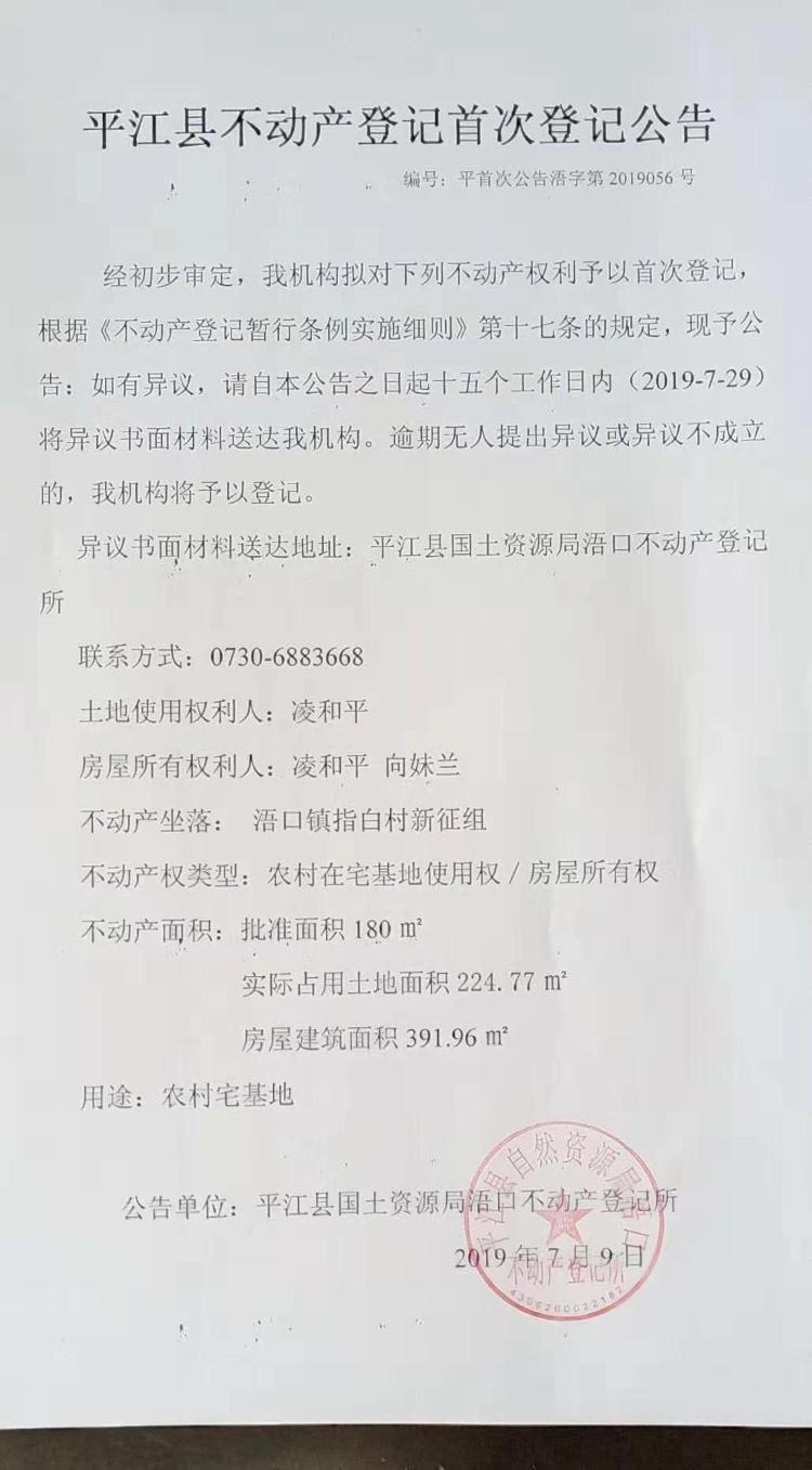 凌和平平江县不动产首次登记公告平首次公告浯字第2019056号