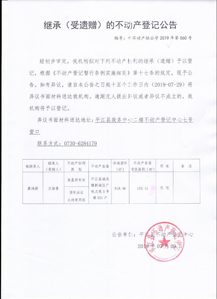 王细香继承(受遗赠)的不动产登记公告平不动产继公字2019年第060号