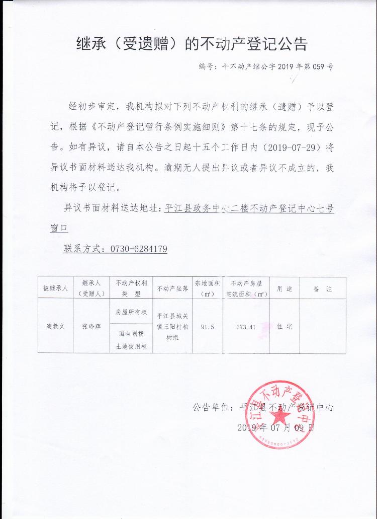 张玲辉继承(受遗赠)的不动产登记公告平不动产继公字2019年第059号