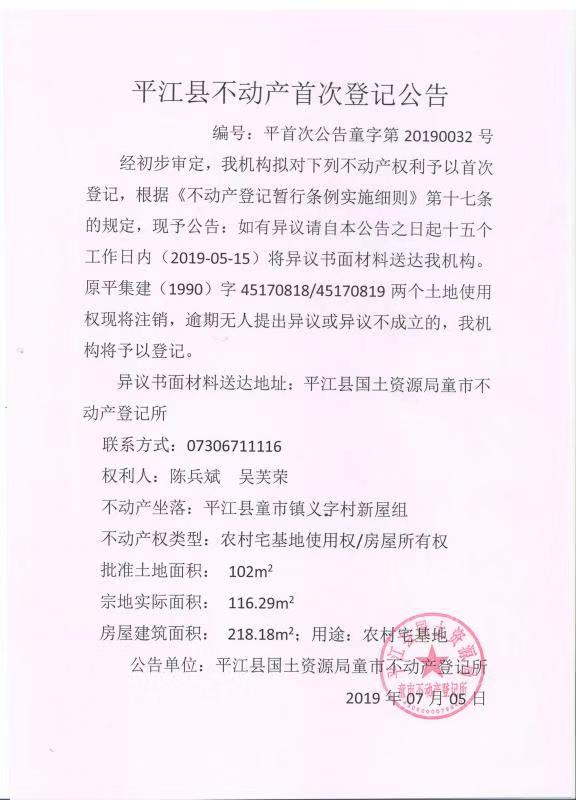 陈兵斌 吴芙荣 平江县不动产首次登记公告 平首次公告童字第20190032号